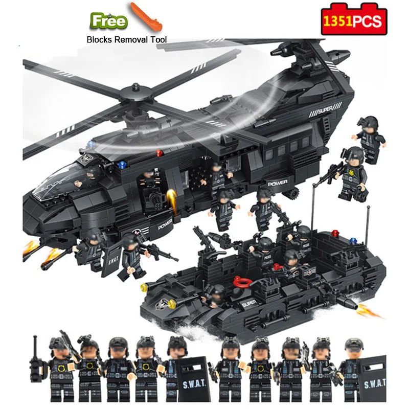ORIGINAL Military Series 1351pcs Model Building Blocks Kits SWAT Team Transport Helicopter City Police Toys